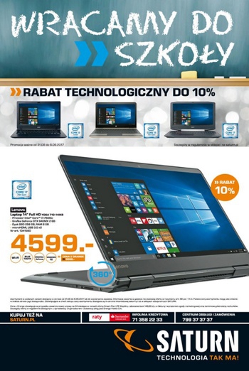 {loadposition linkMediaMarkt} Nowa gazetka promocyjna Saturn - "Wracamy do szkoły" z rabatem technologicznym 10%. Polecane promocje z gazetki Saturn: Laptop LENOVO Yoga 710-14IKB - 4599 zł. Laptop ACER Aspire V3-372-3235 - 2399 zł. Laptop HP Pavilion x360…