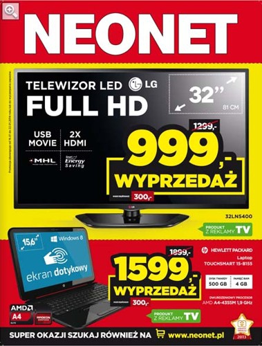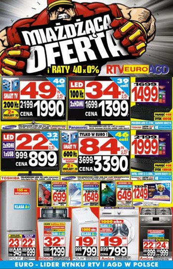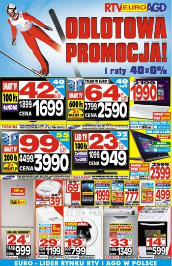 Najnowsza gazetka promocyjna RTV EURO AGD - "Miażdżąca oferta". Polecane promocje z gazetki RTV EURO AGD: Telewizor LED 3D 40" Samsung UE40F6320 - 1990 zł. Laptop Toshiba Satellite C50D-A-133 W8.1 - 1499 zł. Lodówka Polar PCB 261 A+…