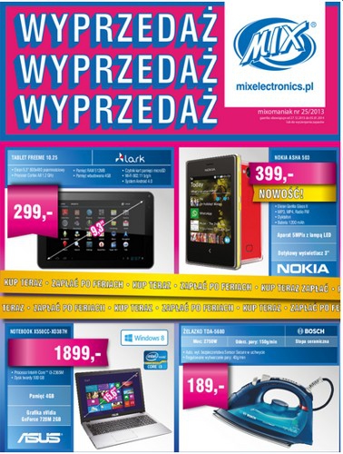 Nowa gazetka promocyjna Mix Electronics - "Wyprzedaż". Polecane promocje z gazetki Mix Electronics: Tablet multimedialny LARK FREEME 10.25 - 299 zł. Żelazko BOSCH SENSORSECURE TDA5680 - 189 zł. Laptop ASUS X550CC-XO387H - 1899 zł. Oferta ważna od…