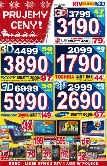 Najnowsza gazetka promocyjna RTV EURO AGD - "Prujemy ceny II". Polecane promocje z gazetki RTV EURO AGD: Telewizor LED 3D 50" Panasonic TX-P50VT60E - 5990 zł. Telewizor LED 3D 47" LG 47LA660S - 3190 zł. Laptop Asus X550CA-XO090H…