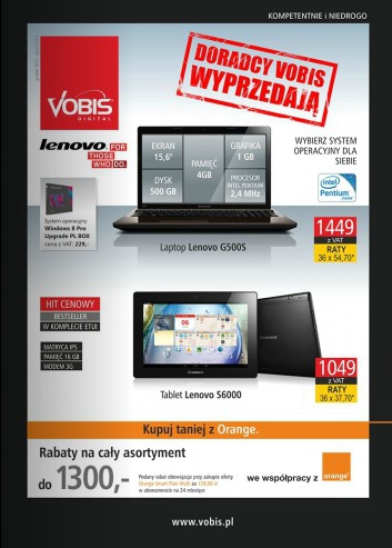 {loadposition linkVobis} Gazetka promocyjna Vobis styczeń 2014 - "Doradcy Vobis wyprzedają". Polecane promocje z gazetki Vobis: Laptop Lenovo G500S - 1449 zł. Tablet Lenovo G6000 - 1049 zł. Laptop Samsung ATIV Book 2 - 1799 zł. Oferta ważna…