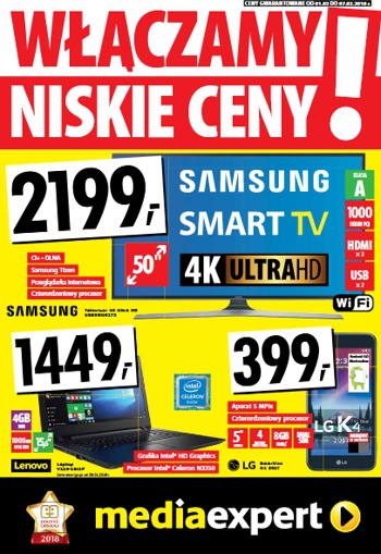 {loadposition linkMediaExpert} Nowa gazetka promocyjna sieci sklepów Media Expert - "Włączamy niskie ceny!". Polecane promocje z gazetki Media Expert: Smartfon HUAWEI P9 Lite Mini - 599 zł. Telewizor 4K Ultra HD 55 cali LG 55UJ620V - 2380 zł.…