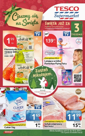 Nowa gazetka promocyjna Tesco - "Cieszmy się na święta". Polecane promocje z gazetki Tesco: Latająca wróżka Flutterbye Flying Fairy - 139 zł. Klementynki Kids Tesco 600 g - 1,99 zł. Cukier 1 kg - 1,99 zł. Oferta…