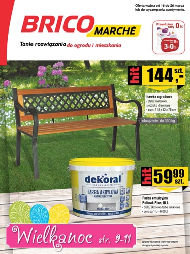 {loadposition linkBricomarche} Nowa gazetka promocyjna Bricomarche. Polecane promocje z gazetki Bricomarche: Ławka ogrodowa - 144 zł. Farba emulsyjna Dekoral Polinak Plus 10 L - 59,99 zł. Kompakt WC Merida z deską wolnoopadającą - 249 zł. Oferta ważna od…
