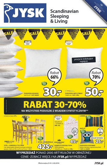Nowa gazetka promocyjna JYSK. Polecane promocje z gazetki Jysk: Rabat 30-70% na wszystkie poduszki z wkładem syntetycznym. Rabat 20-55% na wszystkie regały. Rabat 20-50% na wszystkie ławy. Oferta ważna od 21.01 do 3.02.