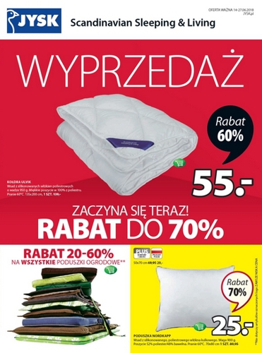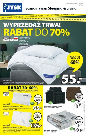 Nowa gazetka promocyjna sieci sklepów JYSK - "Wyprzedaż trwa! Rabat do 70%". Polecane promocje z gazetki Jysk: Rabat 30-60% na wszystkie poduszki Wellpur. Rabat 20-50% na wszystkie ławy i stoliki TV. Rabat 30-60% na wszystkie materace…