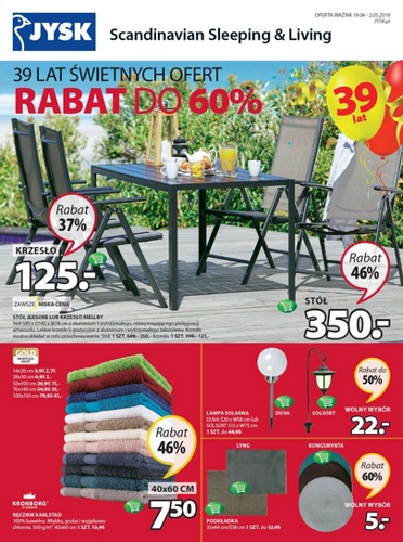 '39 lat świetnych ofert' - nowa gazetka promocyjna sieci sklepów JYSK. Polecane promocje z gazetki Jysk: Rabat 20-40% na wszystkie latarnie ogrodowe. Rabat 20-40% na wszystkie ławy i stoliki. Rabat 20-50% na wszystkie komody. Dni…