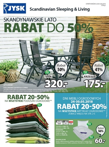 'Skandynawskie lato' - nowa gazetka promocyjna sieci sklepów JYSK. Polecane promocje z gazetki Jysk: Rabat 20-40% na wszystkie biurka. Rabat 20-40% na wszystkie ławy i stoliki. Rabat 20-50% na wszystkie materace serii Gold. Dni mebli…