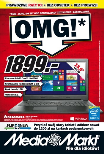 {loadposition linkMediaMarkt} Nowa gazetka promocyjna Media Markt - "OMG!". Polecane promocje z gazetki Media Markt: Notebook LENOVO G50-70 59-428140 - 1899 zł. Notebook LENOVO G50-30 80G0009FPB - 969 zł. Tablet SONY Xperia Z2 + stacja dokująca - 1899 zł.…