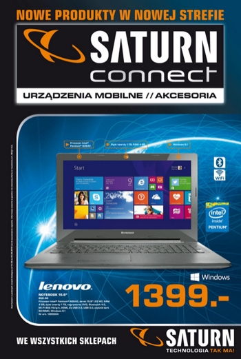 {loadposition linkMediaMarkt} Nowa gazetka promocyjna Saturn - "Nowe produkty w nowej strefie Saturn Connect". Polecane promocje z gazetki Saturn: Notebook LENOVO G50-30 80G001QGPB - 1399 zł. Tablet APPLE iPad Air 2 16GB Wi-Fi - 2099 zł. Notebook APPLE MacBook…
