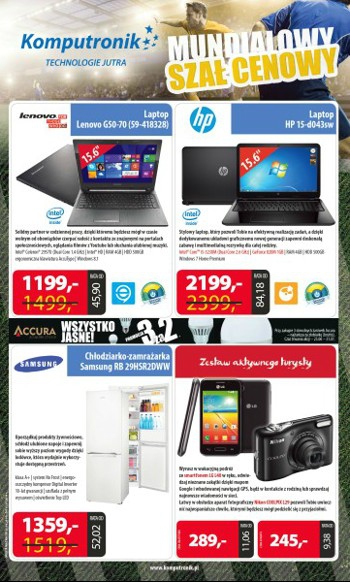 {loadposition linkKomputronik} Nowa gazetka promocyjna Komputronik - "Mundialowy szał cenowy". Polecane promocje z gazetki Komputronik: Laptop HP HP 15-d043sw - 2199 zł. Laptop Lenovo G50-70 - 1199 zł. Chłodziarko-zamrażarka Samsung RB 29HSR2DWW - 1359 zł. Oferta ważna do…