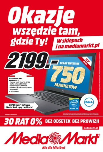 {loadposition linkMediaMarkt} Nowa gazetka promocyjna Media Markt - "Okazje wszędzie tam, gdzie Ty!". Polecane promocje z gazetki Media Markt: Notebook DELL Inspiron 15 3542 - 2199 zł. Notebook LENOVO G50-30 80G00156PB - 1099 zł. Notebook LENOVO G50-70 59-428140 -…