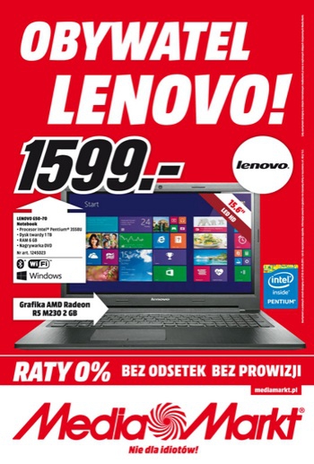 {loadposition linkMediaMarkt} Nowa gazetka promocyjna Media Markt - "Obywatel Lenovo!". Polecane promocje z gazetki Media Markt: Notebook LENOVO G50-70 59-428139/59-435571 - 1599 zł. Notebook LENOVO G50-30 - 1149 zł. Tablet LENOVO Yoga Tablet 2 10 LTE - 1299 zł.…