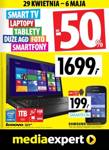 {loadposition linkMediaExpert} Nowa gazetka promocyjna Media Expert - "Smart TV, laptopy, tablety, duże AGD, foto, smartfony do -50%". Polecane promocje z gazetki Media Expert: Notebook LENOVO G50-70 - 1699 zł. Smartfon SAMSUNG GALAXY POCKET 2 SM-G110 - 199 zł.…