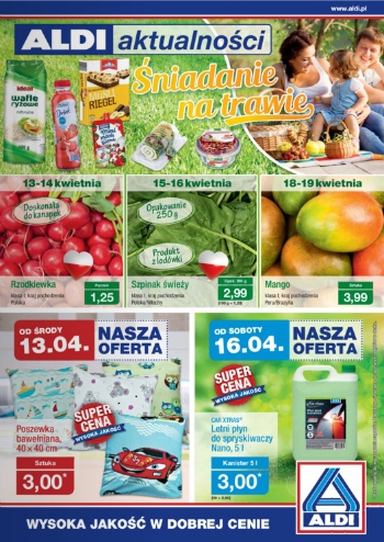 {loadposition linkAldi} Nowa gazetka promocyjna Aldi. Polecane promocje z gazetki Aldi: Poszewka bawełniana 40x40 cm - 3 zł. Letni płyn do spryskiwaczy Nano Car Xtras 5 L - 3 zł. Szpinak świeży 250 g - 2,99 zł. Oferta…