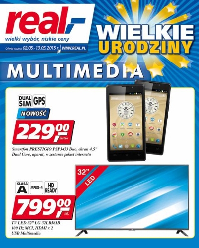 Nowa gazetka promocyjna sieci handlowej Real - "Wielkie urodziny - Multimedia". Polecane promocje z gazetki Real: Smartfon Prestigo PSP3453 Duo - 229 zł. Telewizor LED 32" LG 32LB561B - 799 zł. Uniwersalna mata samochodowa na telefon - 7,99…