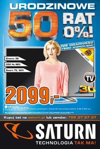 {loadposition linkMediaMarkt} Nowa gazetka promocyjna Saturn - "Urodzinowe 50 rat 0%!". Polecane promocje z gazetki Saturn: Telewizor LED 3D 42" LG 42LA620S - 2099 zł. Telewizor LED 40" SAMSUNG UE40EH5000 - 1599 zł. Notebook LENOVO IdeaPad G500C - 2399…