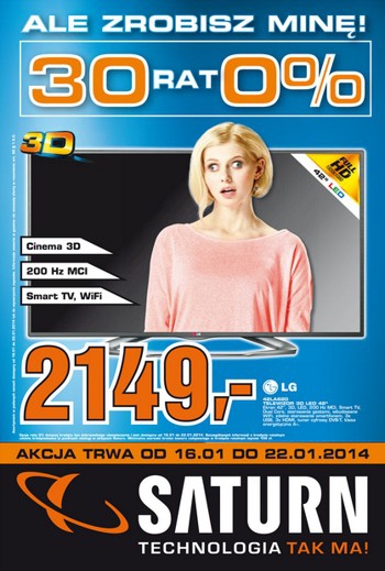 {loadposition linkMediaMarkt} Nowa gazetka promocyjna Saturn - "Ale zrobisz minę! 30 rat 0%". Polecane promocje z gazetki Saturn: Telewizor LED 3D 42" LG 42LA620S - 1999 zł. Telewizor LED 3D 55" SONY KDL-55W905A - 7299 zł. Smartfon APPLE iPhone…