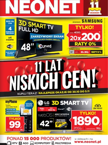 {loadposition linkNeonet} Nowa gazetka promocyjna Neonet - "11 lat niskich cen!". Polecane promocje z gazetki Neonet: Telewizor Curved TV 48" SAMSUNG UE48H6850 - 4000 zł. Telewizor LED 3D 42" LG 42LB650V - 1890 zł. Telefon myPhone 1065 Spectrum -…