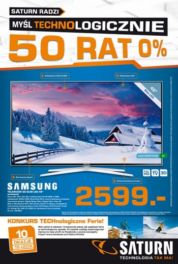{loadposition linkMediaMarkt} Nowa gazetka promocyjna Saturn. Polecane promocje z gazetki Saturn: Telewizor LED 3D 48" SAMSUNG UE48H6400AW - 2599 zł. Telewizor LED 3D 42" LG 42LB650V - 1699 zł. Płyta indukcyjna ELECTROLUX EHH6240ISK - 999 zł. Oferta ważna…
