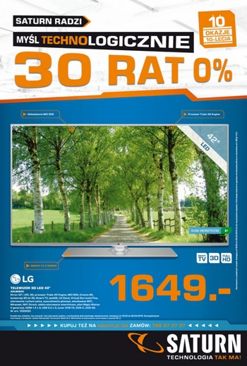 {loadposition linkMediaMarkt} Nowa gazetka promocyjna Saturn - "30 rat 0%". Polecane promocje z gazetki Saturn: Telewizor LED 3D 42" LG 42LB650V - 1649 zł. Telewizor LED 32" LG 32LB561B - 929 zł. Soundbar SAMSUNG HW-H355 - 499 zł. …