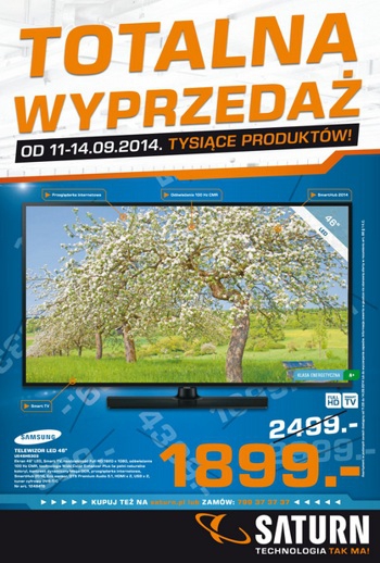 {loadposition linkMediaMarkt} Nowa gazetka promocyjna Saturn - "Totalna wyprzedaż". Polecane promocje z gazetki Saturn: Telewizor LED 46" SAMSUNG UE46H5303AW - 1899 zł. Telewizor 4K Ultra HD 49" LG 49UB850V - 3799 zł. Telewizor LED 42" PANASONIC TX-42AS600E - 1599…