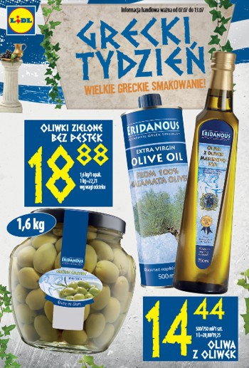 {loadposition linkLidl} Nowa gazetka promocyjna Lidl - "Grecki tydzień". Polecane promocje z gazetki Lidl: Oliwa z oliwek 750 ml - 14,44 zł. Oliwki zielone bez pestek 1,6 kg - 18,88 zł. Ser feta 200 g - 7,77 zł. …