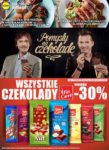 {loadposition linkLidl} Nowa gazetka promocyjna Lidl - "Pomysły na czekoladę". Polecane promocje z gazetki Lidl: Czekolada mleczna z bakaliami Fin Carre 100 g - 1,49 zł. Ser w plastrach Bluedino 500 g - 4,72 zł. Chleb Polski 500 g…