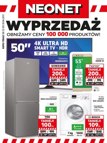 {loadposition linkNeonet} Nowa gazetka promocyjna Neonet - "Wyprzedaż - obniżamy ceny ponad 100 000 produktów!". Polecane promocje z gazetki Neonet: Telewizor 4K Ultra HD 50 cali Samsung UE50KU6072 - 2499 zł. Smartfon Honor 5X - 799 zł. Lodówka Beko…