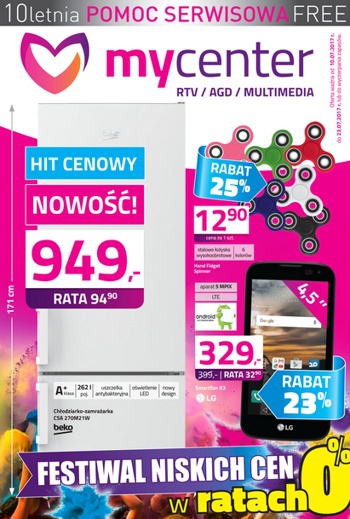Nowa gazetka promocyjna sieci sklepów MyCenter - "Fesiwal niskich cen w ratach 0%". Polecane promocje z gazetki MyCenter: Lodówka BEKO CSA270M21W - 949 zł. Smartfon LG K3 - 329 zł. Płyta gazowa SOLGAZ GPC 4+1 - 2480 zł. …