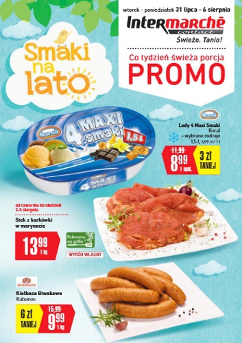 {loadposition linkIntermarche} 'Smaki na lato - co tydzień świeża porcja PROMO' - nowa gazetka promocyjna sieci sklepów Intermarche. Polecane promocje z gazetki Intermarche: Lody Koral 4 Maxi Smaki 1,5 L - 8,99 zł. Stek z karkówki w marynacie…
