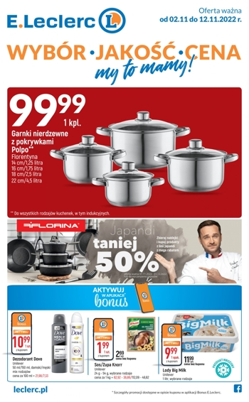 {loadposition linkEleclerc} 'Wybór, jakośc, cena - my to mamy!' - nowa gazetka promocyjna sieci handlowej E.Leclerc. Polecane promocje z gazetki E.Leclerc: Garnki nierdzewne z pokrywkami Polpo Florentyna 1 komplet - 99,99 zł. Dezodorant Dove różne rodzaje - 10,99 zł*.…