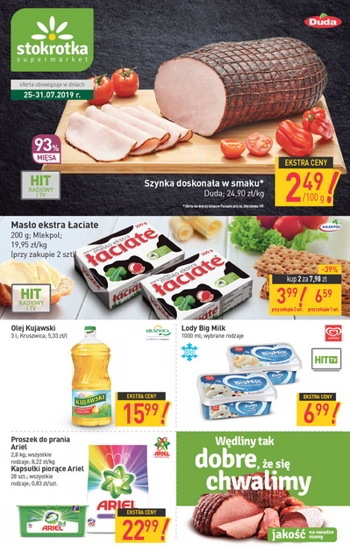 Nowa gazetka promocyjna sieci sklepów Stokrotka. Polecane promocje z gazetki Stokrotka: Szynka doskonała w smaku Duda 100 g - 2,49 zł. Olej Kujawski 3 L - 15,99 zł. Lody Big Milk Algida 1 L - 6,99…