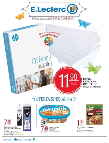 {loadposition linkEleclerc} Nowa gazetka promocyjna sieci handlowej E.Leclerc. Polecane promocje z gazetki E.Leclerc: Papier ksero A4 HP Office 500 arkuszy - 11,99 zł. Dezodorant Rexona 150 ml - 7,49 zł. Lody Big Milk Algida 1 L - 7,49…