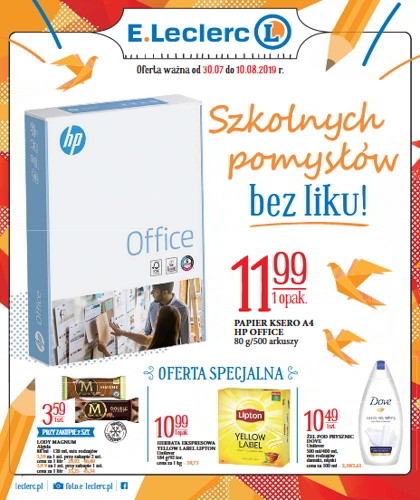 {loadposition linkEleclerc} 'Szkolnych pomysłów bez liku!' - nowa gazetka promocyjna sieci handlowej E.Leclerc. Polecane promocje z gazetki E.Leclerc: Papier ksero A4 HP Office 500 arkuszy - 11,99 zł. Lody Magnum 85 ml - 3,59 zł. Herbata ekspresowa…