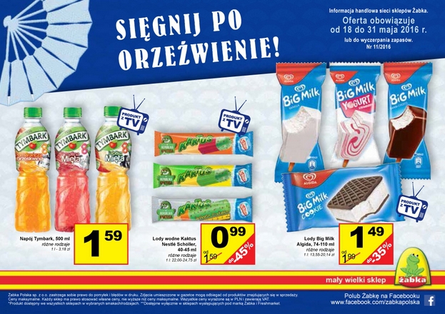 Nowa gazetka promocyjna sieci sklepów Żabka - "Sięgnij po orzeźwienie!". Polecane promocje z gazetki Żabka: Napój Tymbark 500 ml - 1,59 zł. Lody wodne Kaktus Nestle Scholler 40 ml - 0,99 zł. Lody Big Milk Algida 74 ml…