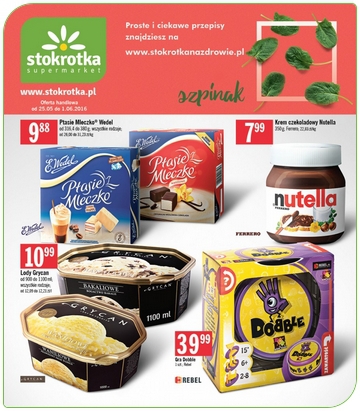 Nowa gazetka promocyjna sieci handlowej Stokrotka. Polecane promocje z gazetki Stokrotka: Ptasie Mleczko Wedel różne rodzaje - 9,88 zł. Krem czekoladowy Nutella 350 g - 7,99 zł. Lody Grycan różne rodzaje - 10,99 zł. Oferta ważna od…