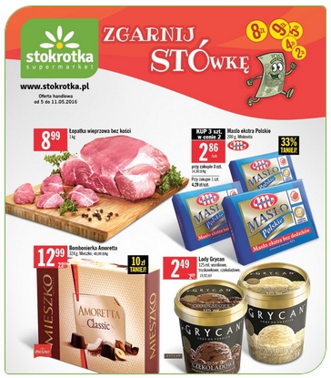 Nowa gazetka promocyjna sieci handlowej Stokrotka. Polecane promocje z gazetki Stokrotka: Łopatka wieprzowa bez kości 1 kg - 8,99 zł. Bombonierka Amoretta Mieszko 324 g - 12,99 zł. Lody Grycan 125 ml - 2,49 zł. Oferta ważna…