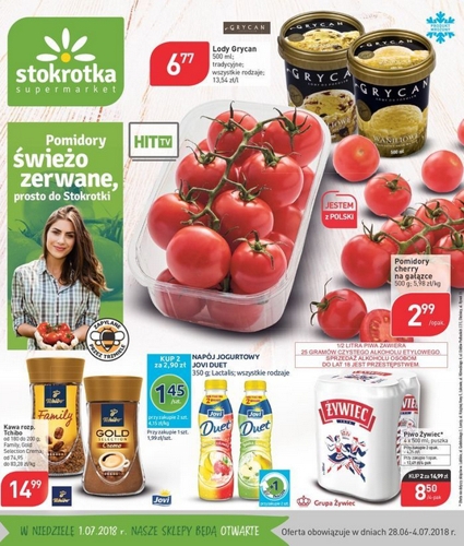 'Pomidory świeżo zerwane, prosto do Stokrotki' - nowa gazetka promocyjna sieci sklepów Stokrotka. Polecane promocje z gazetki Stokrotka: Pomidory cherry na gałązce 500 g - 2,99 zł. Lody Grycan 500 ml - 6,77 zł. Napój jogurtowy Jovi Duet…