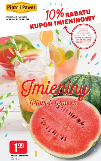 'Imieniny' - nowa gazetka promocyjna sieci sklepów Piotr i Paweł. Polecane promocje z gazetki Piotr i Paweł: Arbuz czerwony 1 kg - 1,99 zł. Lody jak dawniej Bracia Koral 900 ml - 10,99 zł. Lody Pura Vida 500…