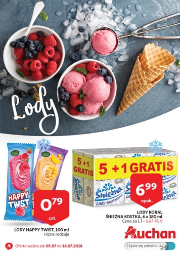 {loadposition linkAuchan} 'Lody' - nowa gazetka promocyjna sieci marketów Auchan. Polecane promocje z gazetki Auchan: Lody Happy Twist 100 ml - 0,79 zł. Lody Koral Śnieżna Kostka 6x180 ml - 6,99 zł. Lody Pirulo Banani 45 ml - 1,19…