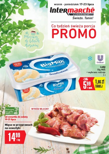 {loadposition linkIntermarche} 'Co tydzień świeża porcja PROMO' - nowa gazetka promocyjna sieci sklepów Intermarche. Polecane promocje z gazetki Intermarche: Lody Big Milk 1 L - 5,99 zł. Mięso w przyprawach na szaszłyki 1 kg - 14,99 zł.…