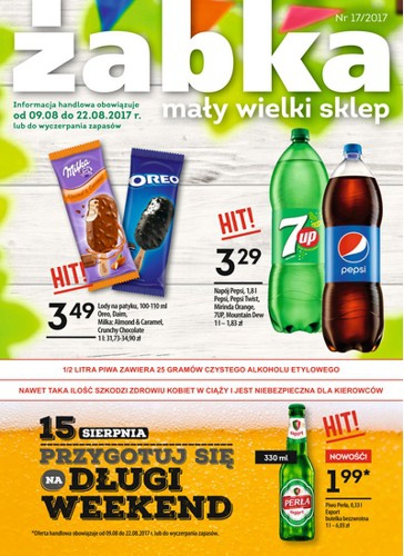 Nowa gazetka promocyjna sieci sklepów Żabka. Polecane promocje z gazetki Żabka: Lody na patyku Oreo 100 ml - 3,49 zł. Piwo Perła Export 330 ml - 1,99 zł. Pepsi, Pepsi Twist, Mirinda Orange, 7Up lub Mountain Dew 1,8…