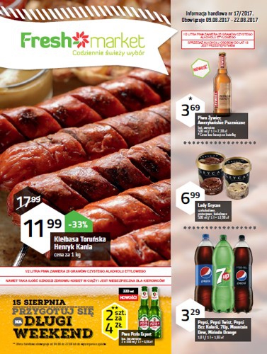 {loadposition linkFreshmarket} Nowa gazetka promocyjna sieci sklepów Freshmarket. Polecane promocje z gazetki Freshmarket: Kiełbasa toruńska Henryk Kania 1 kg - 11,99 zł. Piwo Żywiec Amerykańskie Pszeniczne 500 ml - 3,69 zł. Lody Grycan 500 ml - 6,99…