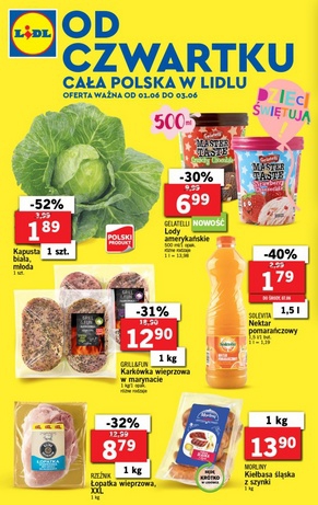 {loadposition linkLidl2} Nowa gazetka promocyjna Lidl - "Od czwartku cała Polska w Lidlu". Polecane promocje z gazetki Lidl: Lody amerykańskie Gelatelli 500 ml - 6,99 zł. Nektar pomarańczowy Solevita 1,5 L - 1,79 zł. Kiełbasa śląska z szynki Morliny…