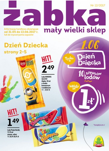 Nowa gazetka promocyjna sieci sklepów Żabka - "Dzień Dziecka". Lody Pirulo Nestle 73 ml - 1,49 zł. Lody Minions Gelatio 90 ml - 2,49 zł. Lody Gucio Augusto 52 ml - 2,49 zł. Oferta ważna od…