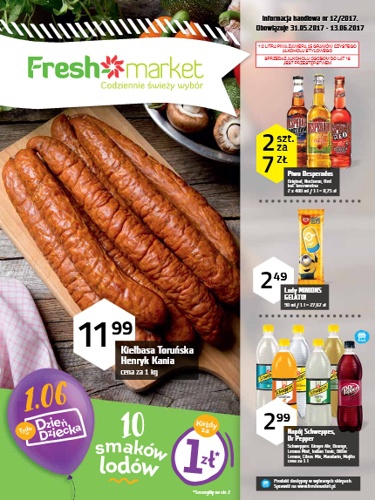 {loadposition linkFreshmarket} Nowa gazetka promocyjna Freshmarket. Polecane promocje z gazetki Freshmarket: Kiełbasa toruńska Henryk Kania 1 kg - 11,99 zł. Piwo Desperados 2x400 ml - 7 zł. Lody Minions Gelatio 90 ml - 2,49 zł. …