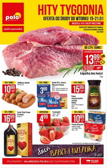 'Hity tygodnia' - nowa gazetka promocyjna sieci sklepów Polo Market. Polecane promocje z gazetki Polo Market: Łopatka bez kości 1 kg - 13,99 zł*. Tonik Vital Power ProHeart Kruger 1 L - 16,99 zł. Truskawki 250 g…