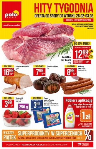 'Hity tygodnia' - nowa gazetka promocyjna sieci sklepów Polo Market. Polecane promocje z gazetki Polo Market: Łopatka bez kości 1 kg - 12,99 zł*. Polędwica sopocka Pekpol 1 kg - 16,99 zł. Pomidory Adora 1 kg -…