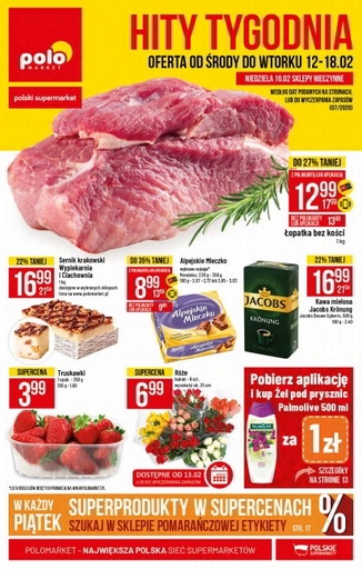 'Hity tygodnia' - nowa gazetka promocyjna sieci sklepów Polo Market. Polecane promocje z gazetki Polo Market: Łopatka bez kości 1 kg - 12,99 zł*. Sernik krakowski Wypiekarnia i Ciachownia 1 kg - 16,99 zł. Kawa mielona Jacobs…